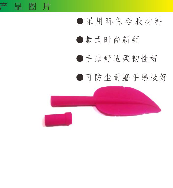 13712483599羽毛形狀硅膠筆套,是硅膠制品中的一種,由東莞帝博硅膠制品廠家創(chuàng)意研發(fā),在筆套內(nèi)套上直徑為6cm左右大的筆芯即可使用,材料選用環(huán)保硅膠高溫成型,無毒無味,產(chǎn)品柔軟有彈性,而且非常的有手感,書寫更華麗。適合很多場(chǎng)合使用,搭配鮮艷的顏色更是讓這款產(chǎn)品如虎添翼,找不出一點(diǎn)瑕疵。