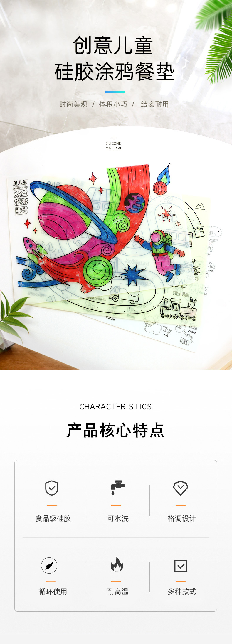 硅膠涂鴉畫板產(chǎn)品的主要買點(diǎn)源于產(chǎn)品的表面圖案以及配套的創(chuàng)意,產(chǎn)品從6-12歲之間具有不同的主題與認(rèn)知圖案,可以連接整體進(jìn)行學(xué)習(xí)提升大腦開發(fā),加強(qiáng)兒童動(dòng)手能力以及創(chuàng)新創(chuàng)作能力,此外產(chǎn)品配比水性可清洗彩色筆,不會(huì)對(duì)硅膠表面產(chǎn)生筆污以及筆畫痕跡,材料屬于柔軟回彈食品級(jí)硅膠,所以硅膠店鋪可以任意曲折來回折疊不會(huì)變形損壞,此外硅膠墊片可水性可隔熱,可耐高低溫,可以在多個(gè)行業(yè)領(lǐng)域當(dāng)中運(yùn)用!