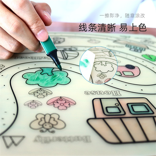 材料環(huán)保柔軟,硅膠墊廠家采用優(yōu)質(zhì)食品級(jí)硅膠材料生產(chǎn)加工,經(jīng)過高溫200度將模紙轉(zhuǎn)印二次成型達(dá)到表面底色圖案效果,過200度高溫具有優(yōu)良附著力,多種創(chuàng)作思維底色圖案,可鍛煉兒童的思維能力以及創(chuàng)作能力,優(yōu)質(zhì)水性筆不留筆污色痕,可可隨意涂改反復(fù)使用,反復(fù)涂鴉!